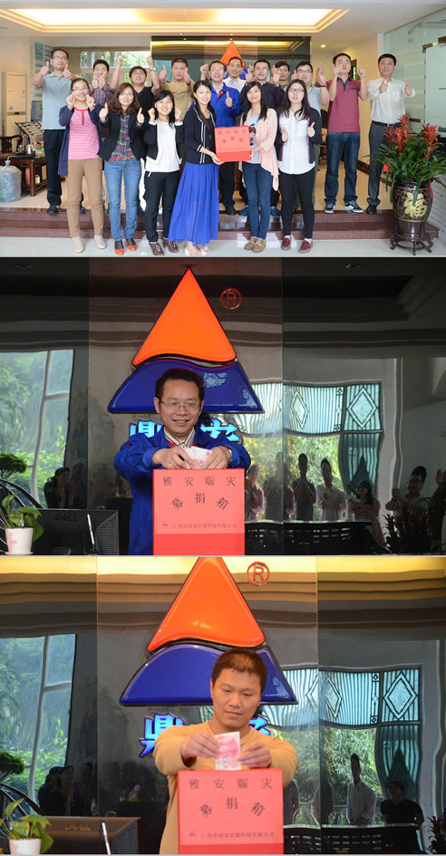 面對突如其來的自然災(zāi)難,鼎安公司心系災(zāi)區(qū),公司領(lǐng)導(dǎo)第一時(shí)間作出反應(yīng)。4月22日下午,鼎安公司黨支部在全公司范圍內(nèi)組織了“支援雅安震災(zāi)捐款活動(dòng)”。鼎安公司全體員工踴躍參加,積極奉獻(xiàn)愛心,一共募捐到人民幣8646.5元、美金200元,為雅安同胞獻(xiàn)上自己的一份力量。
