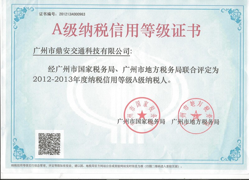 經(jīng)廣州市國(guó)家稅務(wù)局、廣州市地方稅務(wù)局聯(lián)合評(píng)定,我司榮獲2012-2013年度納稅信用等級(jí)A級(jí)納稅人,在此表示祝賀。