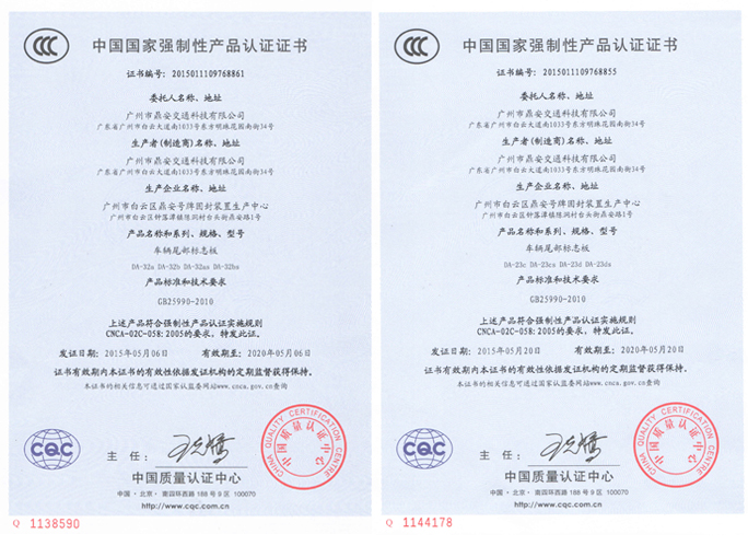 2015年5月,廣州鼎安車輛尾部標(biāo)志板(包括長型和重型)皆獲得首個(gè)車輛尾部標(biāo)志板3C認(rèn)證證書。根據(jù)2014年8月21日新修訂的關(guān)于機(jī)動車輛及安全的《強(qiáng)制性產(chǎn)品認(rèn)證實(shí)施規(guī)則》,從2016年1月1日起,無3C認(rèn)證的車輛尾部標(biāo)志板產(chǎn)品將不允許生產(chǎn)。