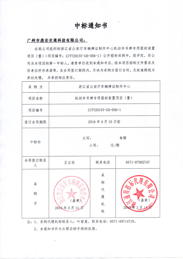 2016年3月,廣州鼎安憑借先進的產品技術、可靠的產品質量、優(yōu)質的服務和個性化的商務政策,在浙江省固封招標競爭中拔得頭籌,榮獲2016年到2017年浙江省固封裝置供應商資格。 從2014年至今,廣州鼎安連續(xù)兩次中標浙江省固封裝置,值得一提的是,本次固封投標全面、細致融合客戶需求,深度定制個性產品,全力以赴滿足客戶的需求。 今后,廣州鼎安會更加注重技術創(chuàng)新和商務運營,為國家道路交通安全產業(yè)提供最優(yōu)質、最可靠、最全面的產品與技術服務。