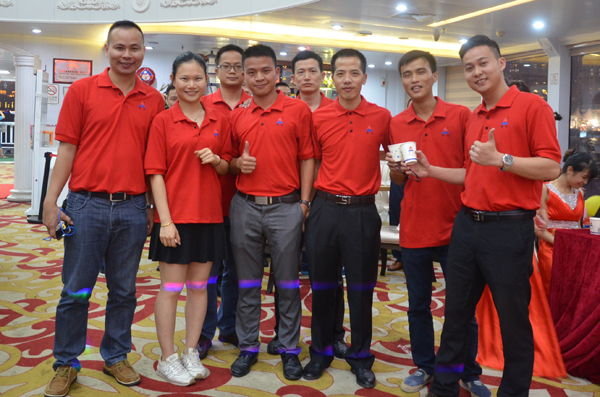 在鼎安全體員工共唱“鼎安之歌”之后,廣州鼎安總經(jīng)理文湘?zhèn)?、副總?jīng)理劉輝、財務(wù)總監(jiān)鄒偉和營銷總監(jiān)張宏新一同上臺,舉杯共飲,共享珠江平安之夜!