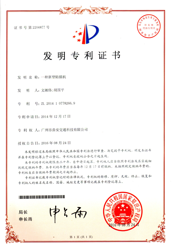 近日,廣州鼎安再獲兩項(xiàng)專利證書,分別是“一種新型貼膜機(jī)”發(fā)明專利和“單層結(jié)構(gòu)車身反光標(biāo)識(shí)貼”外觀設(shè)計(jì)專利兩項(xiàng)專利。