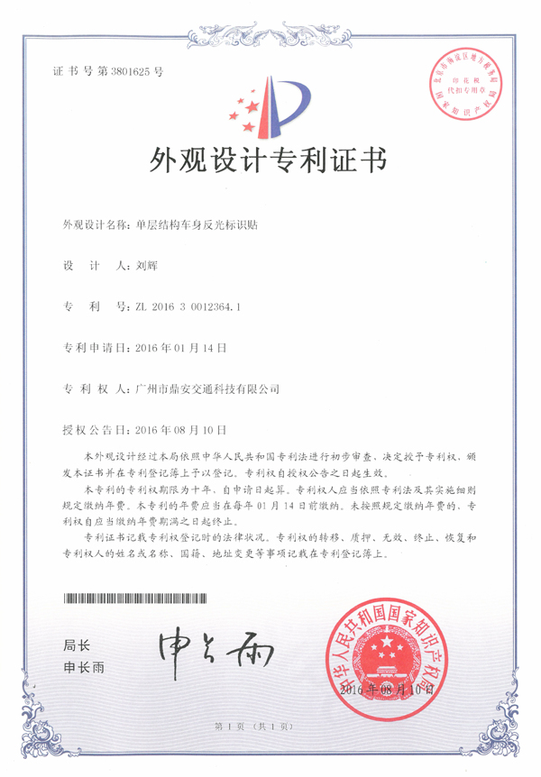“單層結(jié)構(gòu)車身反光標(biāo)識(shí)貼”外觀設(shè)計(jì)專利:對鼎安新開發(fā)的反光標(biāo)識(shí)產(chǎn)品的形狀、圖案或其結(jié)合以及色彩與形狀、圖案的新設(shè)計(jì)進(jìn)行保護(hù)。