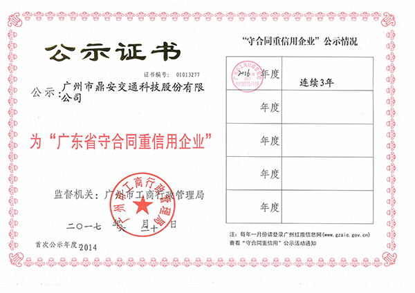鼎安交通連續(xù)三次獲得“廣東省守合同重信用企業(yè)”榮譽(yù),是工商總局對我司誠信經(jīng)營的肯定。鼎安交通將以此為契機(jī),繼續(xù)發(fā)揚(yáng)誠實(shí)守信、依法經(jīng)營的優(yōu)良作風(fēng),重視企業(yè)信譽(yù),完善合同管理流程和制度,規(guī)范合同管理,加強(qiáng)合同履約意識,樹立企業(yè)守法履約的良好形象,不斷提升經(jīng)營管理水平,樹立守合同重信用企業(yè)標(biāo)桿,引領(lǐng)行業(yè)健康發(fā)展。