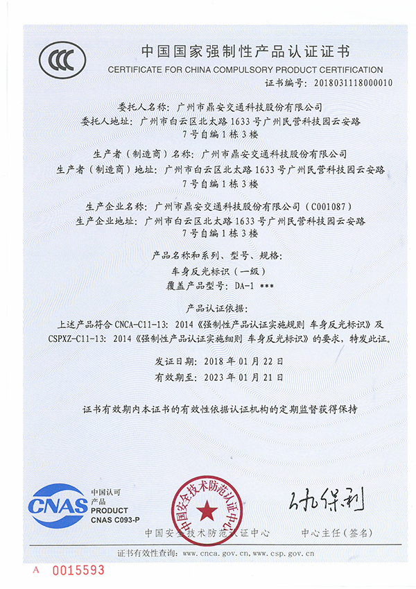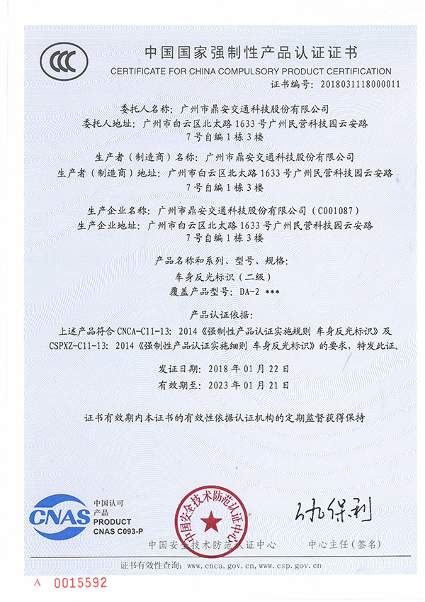 廣州市鼎安交通科技股份有限公司(以下簡(jiǎn)稱(chēng)“公司”)自主研發(fā)的車(chē)身反光標(biāo)識(shí)產(chǎn)品已于2018年1月22日取得由中國(guó)安全技術(shù)防范認(rèn)證中心頒發(fā)的中國(guó)國(guó)家強(qiáng)制性產(chǎn)品認(rèn)證證書(shū)(以下簡(jiǎn)稱(chēng)“3C證書(shū)”)。其中,車(chē)身反光標(biāo)識(shí)(一級(jí))的3C證書(shū)編號(hào)為2018031118000010,車(chē)身反光標(biāo)識(shí)(二級(jí))的3C證書(shū)編號(hào)為2018031118000011。該資質(zhì)的獲得,標(biāo)志著公司的車(chē)身反光標(biāo)識(shí)產(chǎn)品已技術(shù)成熟,質(zhì)量穩(wěn)定,具備批量生產(chǎn)的條件,可正式面向市場(chǎng)銷(xiāo)售和使用。