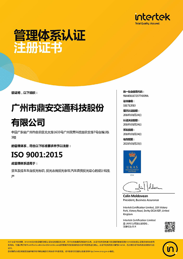 鼎安交通自成立以來,一直嚴(yán)格按照ISO9001:2008國際質(zhì)量管理體系,建立規(guī)范的內(nèi)部質(zhì)量管理體系,現(xiàn)通過提高自身服務(wù)質(zhì)量,規(guī)范服務(wù)體系、完善各項(xiàng)配套設(shè)施、提高員工素質(zhì)等措施,進(jìn)一步規(guī)范和優(yōu)化各項(xiàng)工作制度和流程。公司于2018年1月24日,順利通過了ISO9001:2015質(zhì)量管理體系認(rèn)證,并獲得相應(yīng)證書。