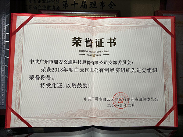 2019年3月22日,白云區(qū)工商聯(lián)(總商會(huì))第十一屆執(zhí)委會(huì)2019年年會(huì)在白云國際會(huì)議中心舉行,會(huì)上,對(duì)白云區(qū)非公有制經(jīng)濟(jì)組織先進(jìn)黨組織進(jìn)行了表彰,廣州市鼎安交通科技股份有限公司黨支部榮獲“白云區(qū)非公有制經(jīng)濟(jì)組織先進(jìn)黨組織”的榮譽(yù)稱號(hào)。