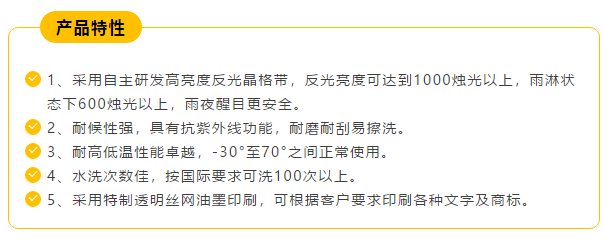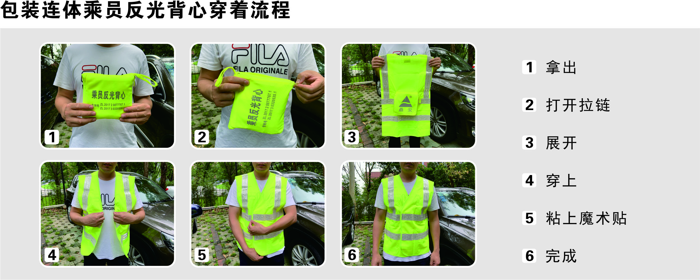 汽車乘員反光背心是配置在汽車上,用于乘員在下車時穿著的具有高可視性的防護(hù)背心。新標(biāo)準(zhǔn)反光背心尺寸為均碼,其胸圍大于等于110cm,衣長為大于等于64cm?;姆垂獠牧项伾珵闊晒馍?,反光條帶寬度不小于50mm,面積不小于0.17㎡,(即每件反光背心的反光條帶寬度為5厘米,長度為3.4米)。