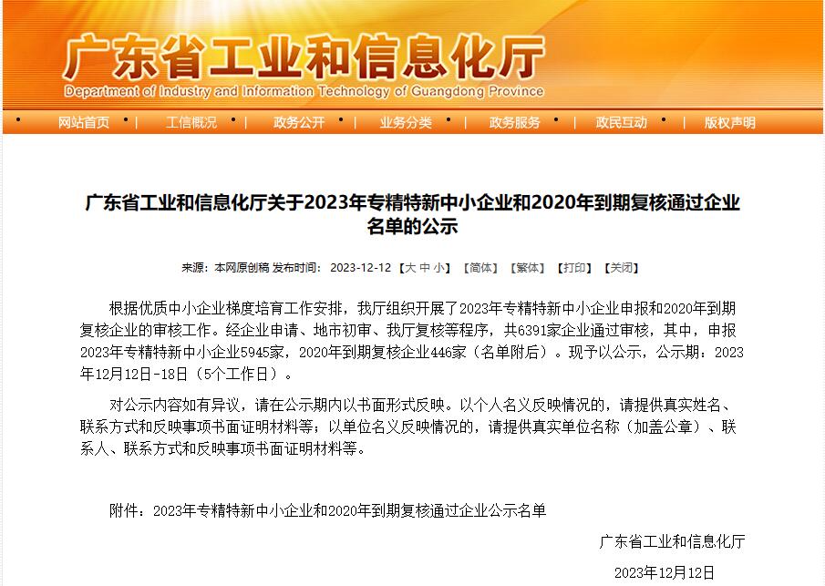 我司提交申報(bào)的2023年廣東省專(zhuān)精特新中小企業(yè)認(rèn)定,于2023年12月12日,通過(guò)了廣東省工信廳組織的審核,并正式公示,公示期2023年12月12日-18日?,F(xiàn)公司正式通過(guò)了認(rèn)定,獲得“廣東省專(zhuān)精特新中小企業(yè)”榮譽(yù)稱(chēng)號(hào)!