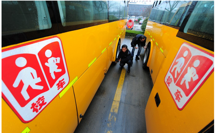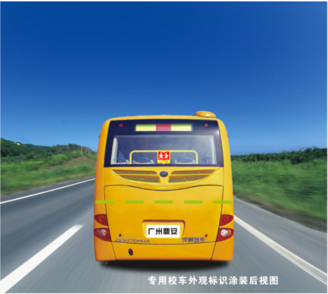 校車(chē)車(chē)高不得大于3.7米,不得設(shè)置車(chē)外行李架,車(chē)頭粘貼中文字符“校車(chē)”顏色為紅色白邊,字體為華文琥珀,字符“?!焙汀败?chē)”。前、后風(fēng)窗玻璃右下角應(yīng)設(shè)置校車(chē)標(biāo)牌,車(chē)身兩側(cè)、尾部應(yīng)該粘貼校車(chē)反光標(biāo)識(shí),兩側(cè)粘貼校車(chē)標(biāo)志。