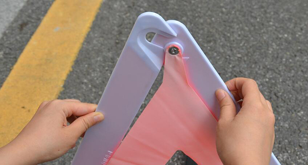 三角警告牌一般是在一個長方形的盒子中被拆散放的,我們拿出來后,首先要拼接起來,方法很簡單,邊角是有卡扣,對準(zhǔn)位置扣好,然后把底座旋轉(zhuǎn)至垂直,這樣警示牌就支起來。