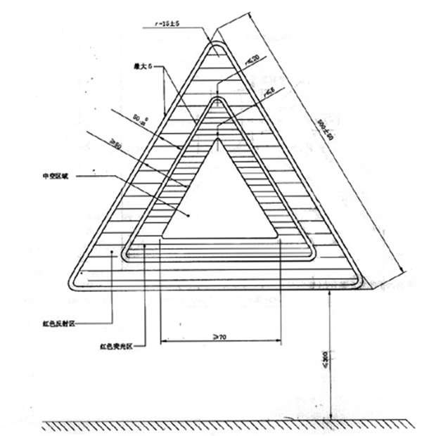 1、警告牌應(yīng)是中空的,外側(cè)為紅色的回復(fù)反射區(qū),內(nèi)側(cè)鄰接的為紅色熒光區(qū),均為同心的等邊三角形。警告牌由支架支撐在距地面一定高度處。