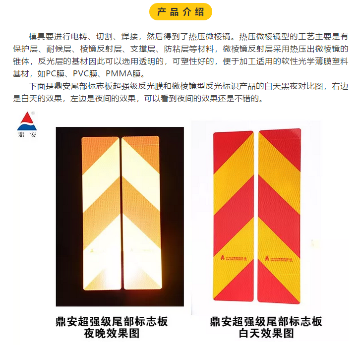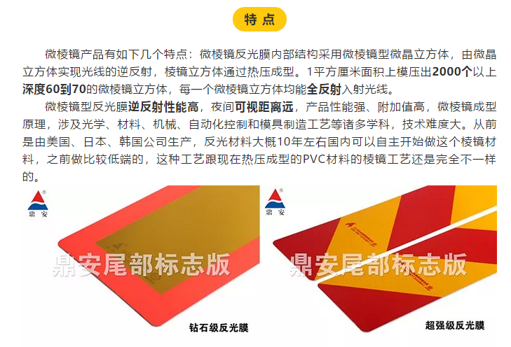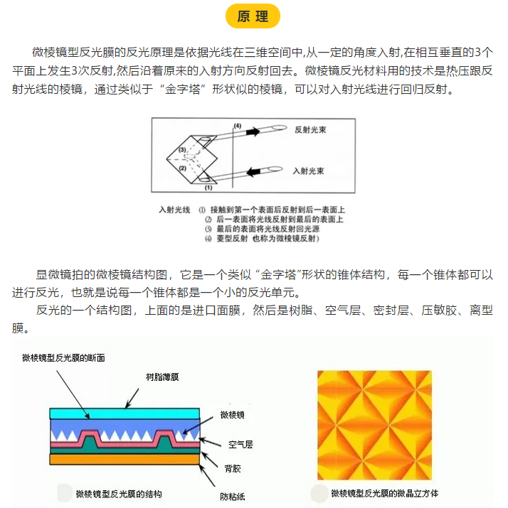 反光膜是近50年發(fā)展起來(lái)的新型功能性復(fù)合材料。微棱鏡型反光膜是80年代后期才發(fā)展起來(lái)的,由于其亮度高,耐久性好,同時(shí)又克服了以往棱鏡型反光材料的有效入射角小,觀察角小,反射光束不對(duì)稱的缺點(diǎn),因而在需要高亮度的公路交通方面的使用越來(lái)越廣泛。下面我們來(lái)認(rèn)識(shí)一下微棱鏡。