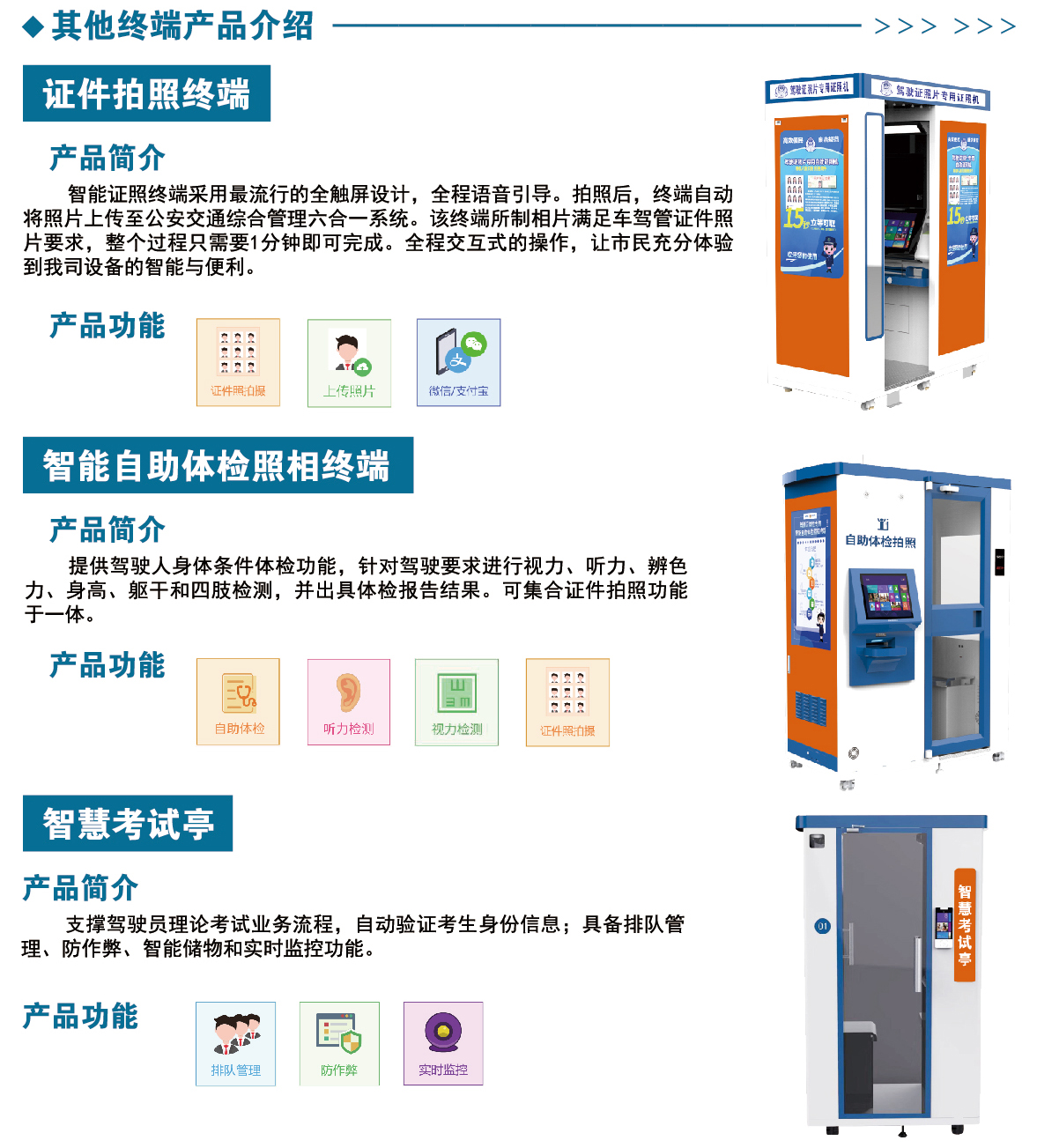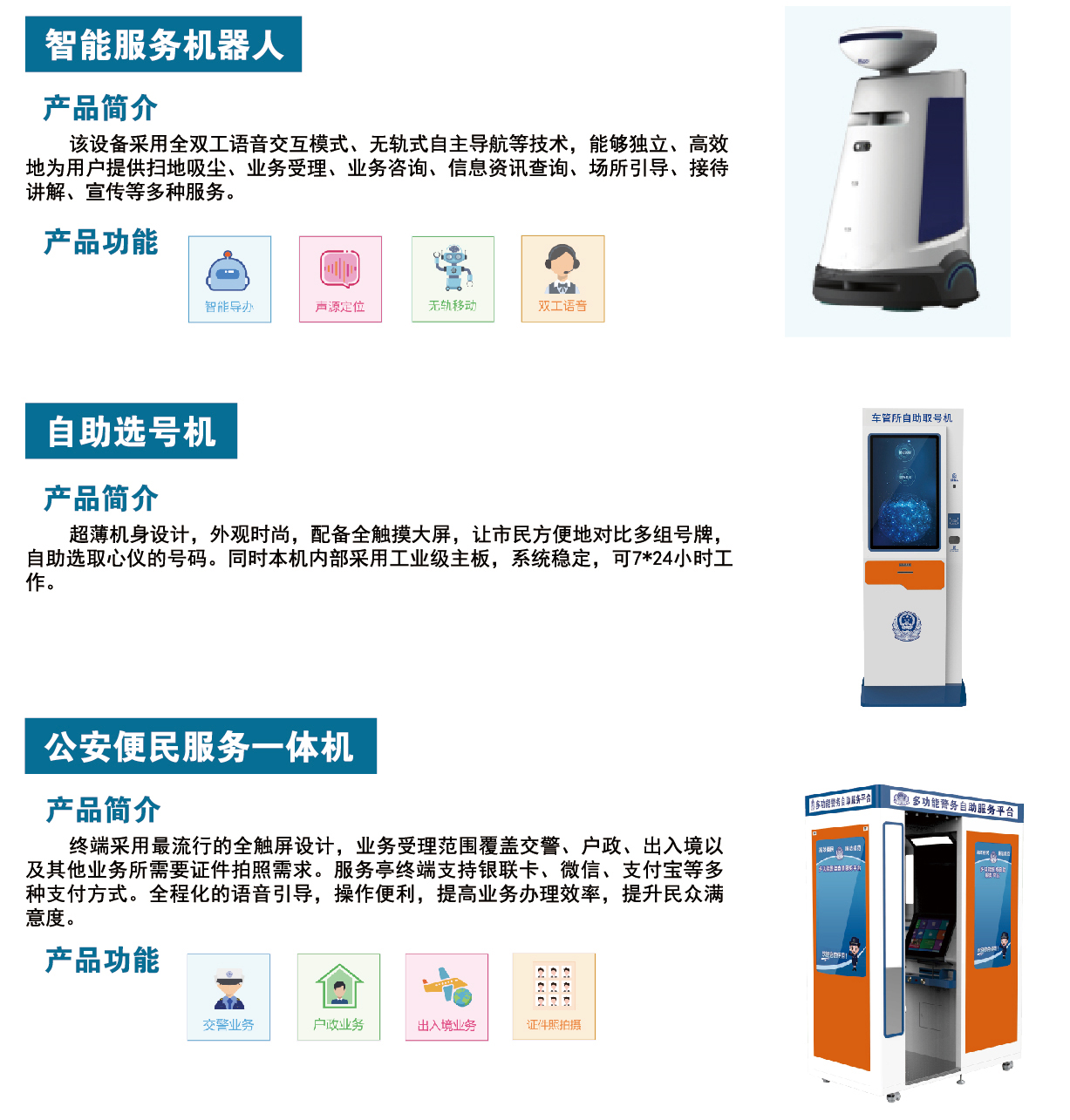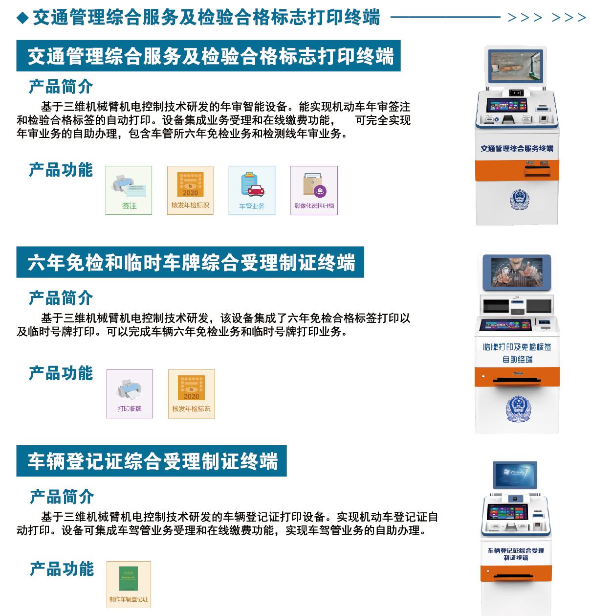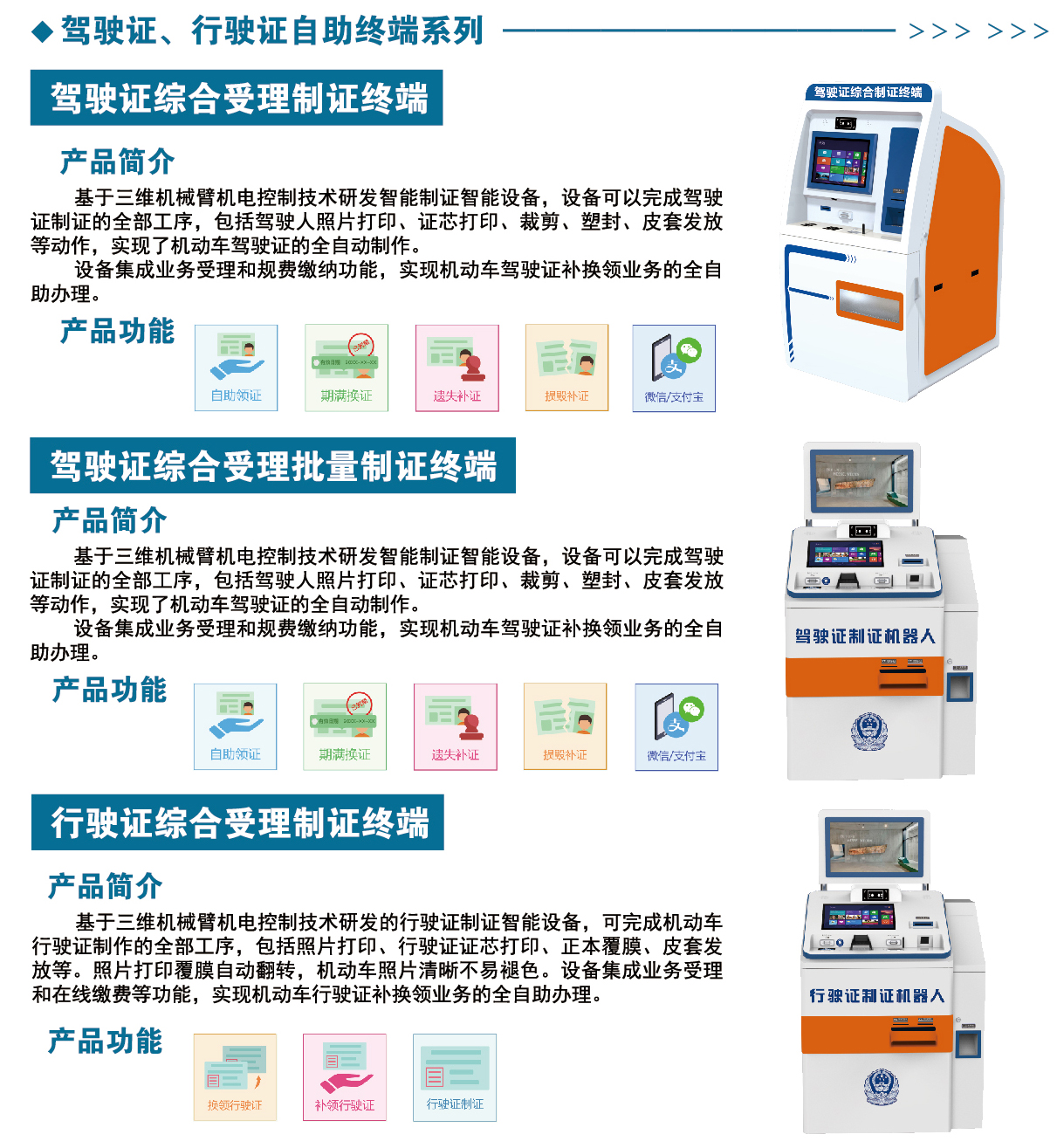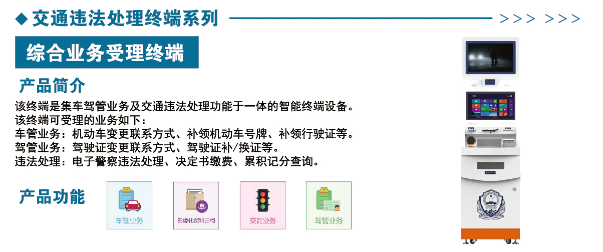 “24小時(shí)智慧車(chē)管所”產(chǎn)品系列齊全,包括以下系列產(chǎn)品:交通違法處理終端系列、駕駛證終端系列、行駛證自助終端系列、證件拍照終端、智能自助體檢照相終端、智慧考試亭、智能門(mén)閘、智能服務(wù)機(jī)器人等等?!?4小時(shí)智慧車(chē)管所”整體解決方案可完成車(chē)管所90%的業(yè)務(wù),真正實(shí)現(xiàn)業(yè)務(wù)全流程自動(dòng)化辦理,滿足不同地區(qū)客戶的使用需求,讓各地群眾都能體現(xiàn)到24小時(shí)不間斷業(yè)務(wù)受理的便捷和快速。
